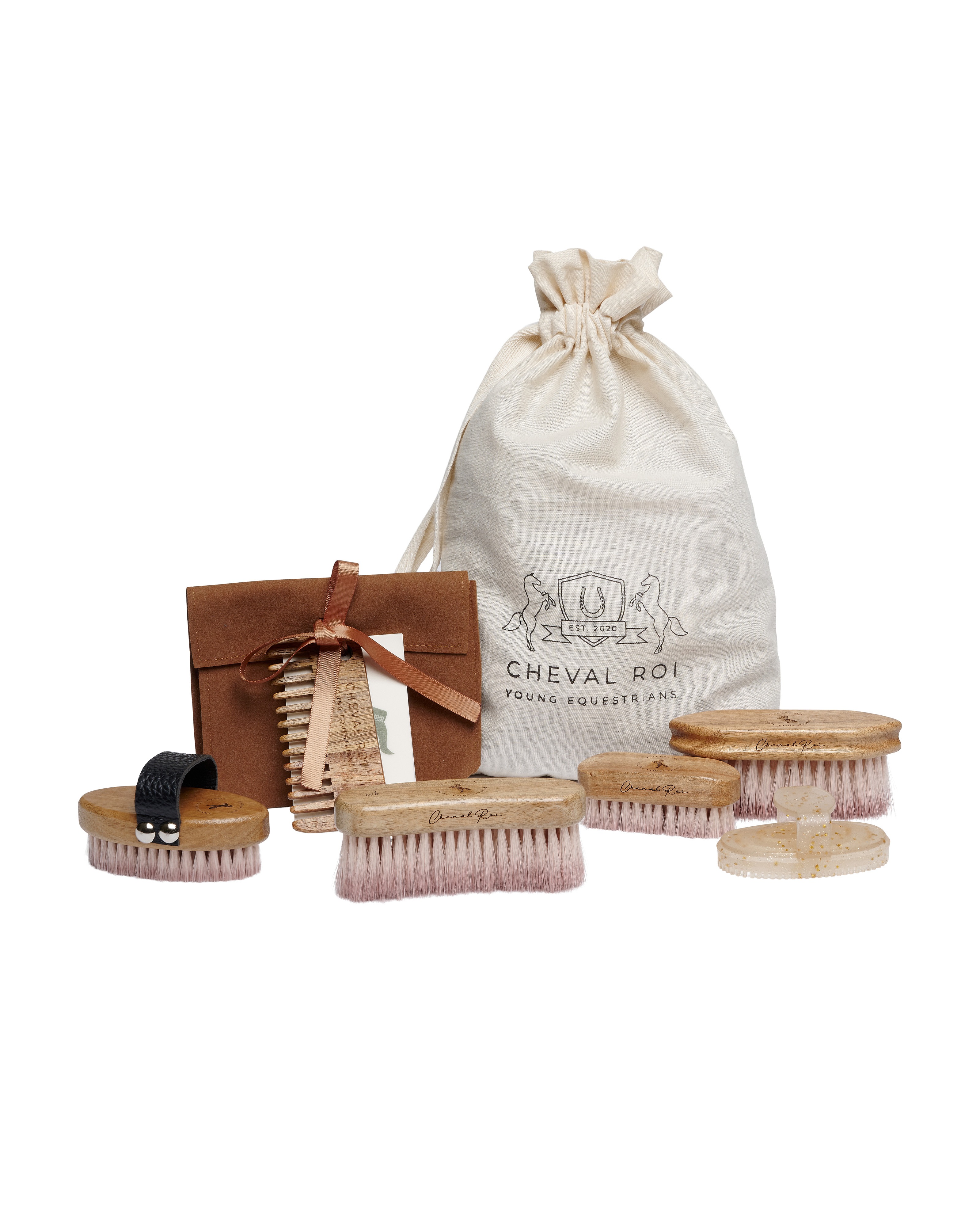 Das Bürstenset für Steckenpferde enthält alle notwendigen Utensilien, um das Spielzeugpferd zu pflegen und sauber zu halten.