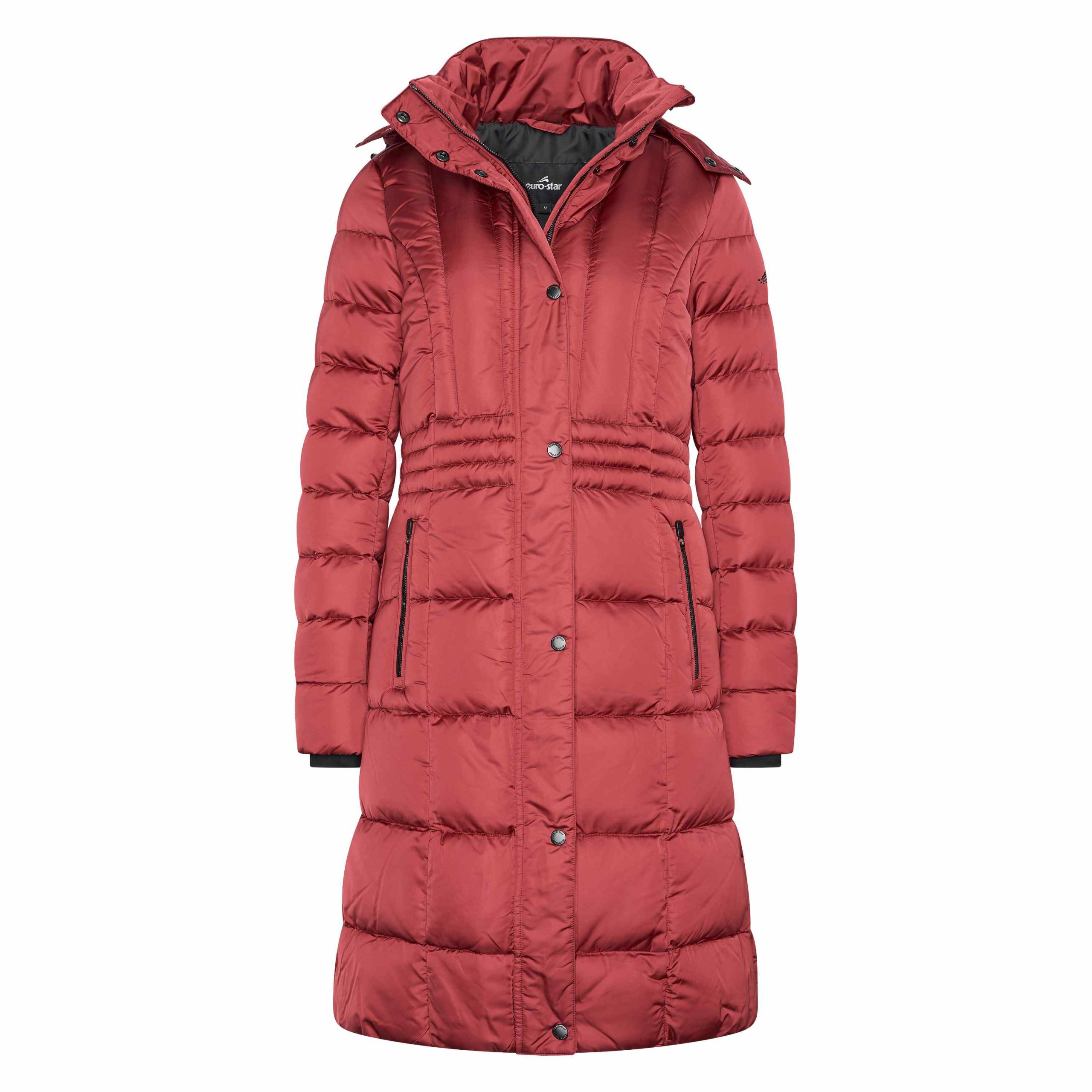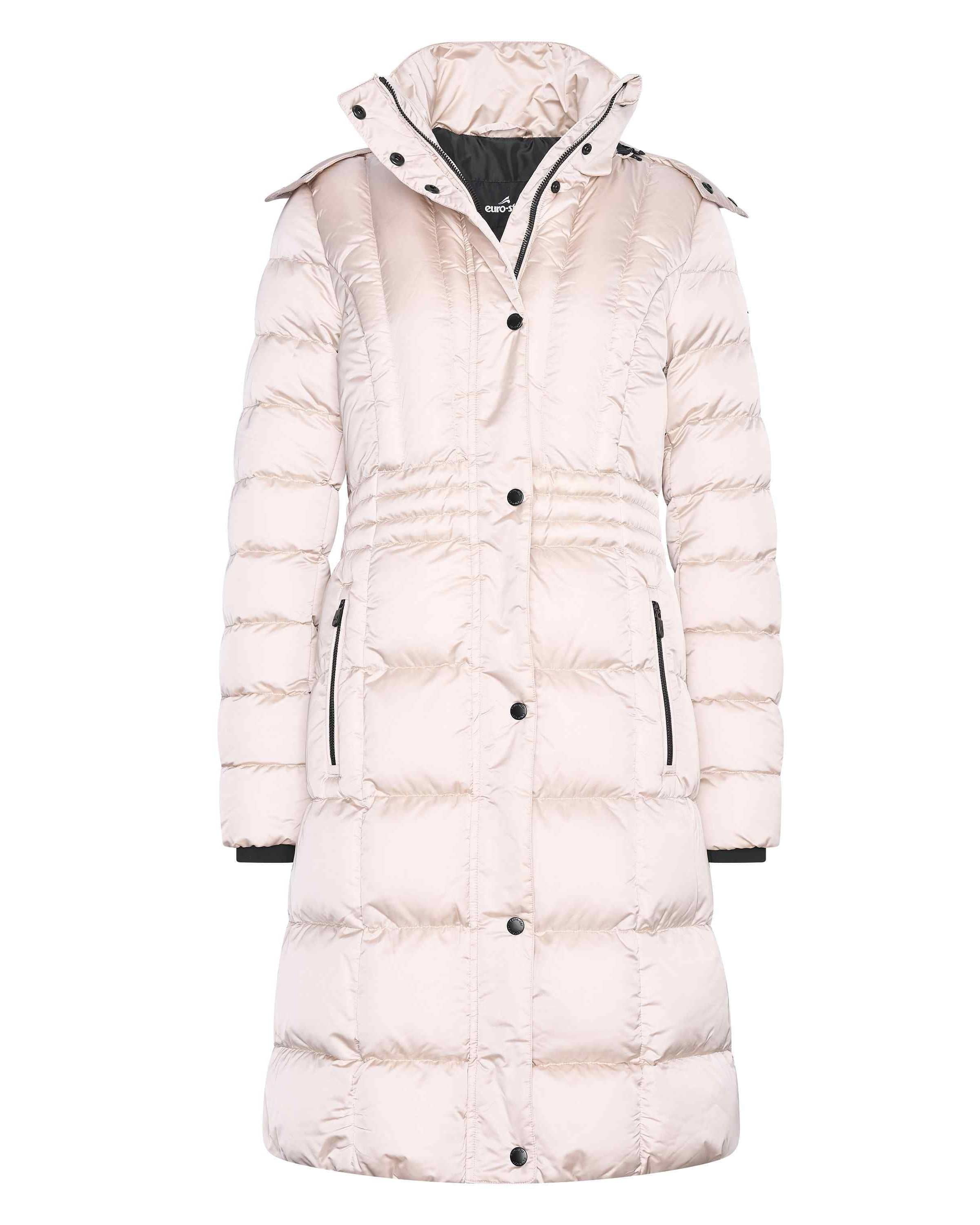 Wattierte Jacke mit gesteppten Konturen in fließender Form. Kapuze mit Band zur Befestigung. Strass-Logo auf dem linken Oberarm. Lycra-Sturmbündchen. 2-Wege-Reißverschluss vorne mit Druckknopfleiste und verdeckter Reißverschluss in der Mitte des Rückens. Taillierte Passform . Verdeckter verstellbarer Rückenschlitz